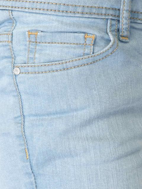 Light blue washed jeans made of 72.7% cotton, 24.4% polyester and 2.9% spandex, has two insert pockets on the front with one change pocket, two patch pockets on the back with thread detailing, brand patch appliqué d on the waistband at the back and a zipper and button closure