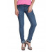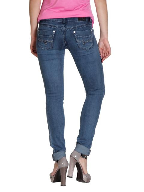 Blue skinny Fit jeans with two scoop pockets in the front and a coin pocket on the right, elasticated waistband for a snug fit with loops for belt, zippered fly with buttoned closure, two patch pockets at the back with branding at the right pocket and at the waistband at the back