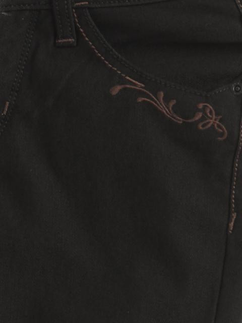 Black denim jeans, two scoop pockets in front with embroidery detail, insert coin pocket on right with piping, yoke and two patch pockets at the back with arquette embroidery, brand patch above right pocket, waistband with loops, zippered fly with button, PU patch with branding at back waistband
