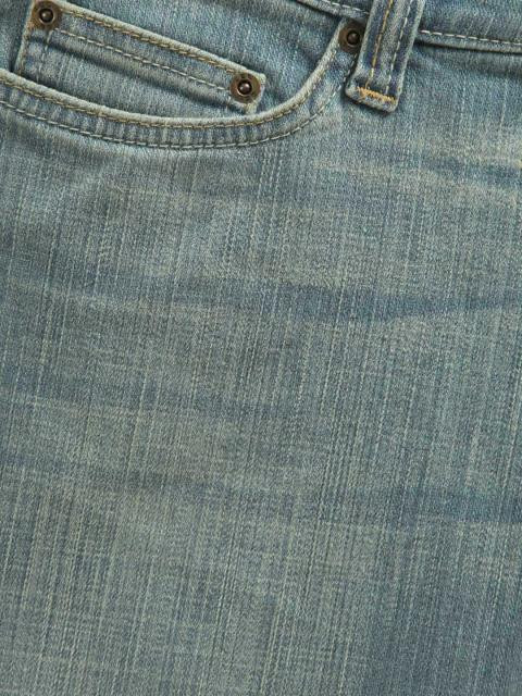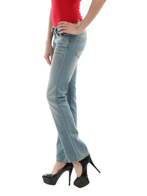 Blue jeans, has two scoop pockets on the front with an insert pocket on the right, yoke and two patch pockets, brand patch at the back, waistband with loops, metal zipper and button closure
