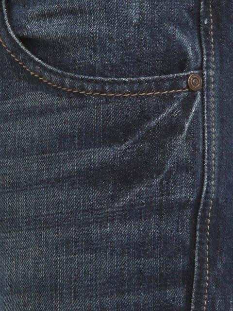 Blue washed jeans, has a zippered and a buttoned closure, belt loops on the waistband, brand patch at the back on the waistband, two insert pockets in front with a coin pocket inside the right pocket, two patch pockets at the back with stitched detailing and a crumpled look on the patch pockets at the back