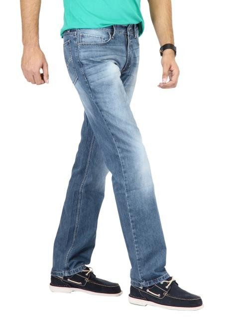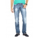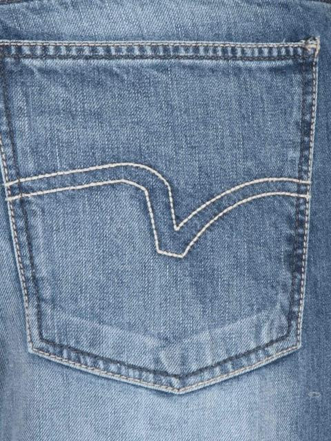 Distressed light blue denim jeans, that has a straight leg, mock crease details, brand name embroidered on the inseam of the waistline, zip fly and five pocket set