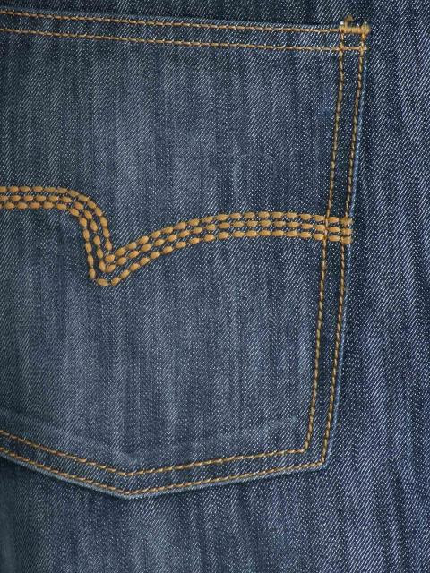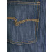 Dark blue jeans made of 100% cotton, has pockets on the sides with a patch pocket inside the right one, two pockets at the back, a looped waist, button and zipper closure on the front, and has contrast colour stitch detailing