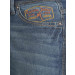 Blue jeans made of 100% cotton, has pockets on the sides with a patch pocket inside the right one and embroidered branding inside the left one, two pockets at the back, a looped waist with fabric tape detailing and brand embroidery on the inseam of the back waist, button and zipper closure on the front, and has contrast colour stitch detailing