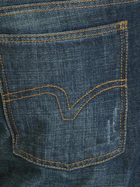 Blue jeans made of 100% cotton, has pockets on the sides with a patch pocket inside the right one, two pockets at the back, a looped waist with brand embroidery on the inseam of the back waist, button and zipper closure on the front, and contrast colour stitch detailing