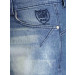 Blue jeans made of 100% cotton, has pockets on the sides with a patch pocket inside the right one and embroidered branding inside the left one, two pockets at the back, a looped waist with fabric tape detailing and brand badge on the inseam of the back waist, button and zipper closure on the front, and has contrast colour stitch detailing
