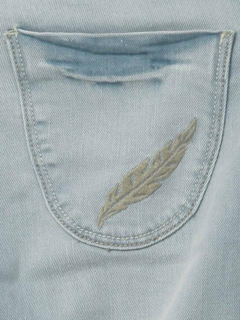 Ice blue jeans with a slight washed and creased look, has loops at the waist band, a buttoned waist and a zipper fly, two front pockets and two patch pockets at the back