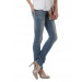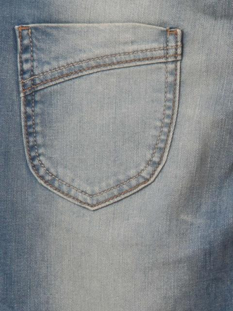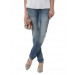 Light blue jeans with a slight washed and creased look, has loops at the waist band, a buttoned waist and a zipper fly, two front prockets (has a smaller pocket at the right pocket) and two patch pockets at the back