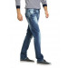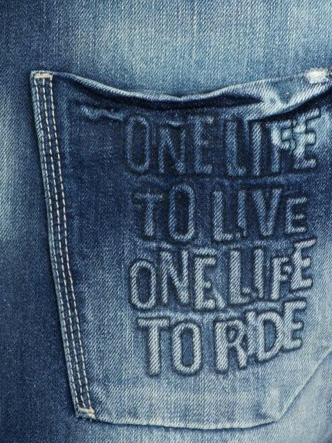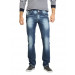Washed and frayed blue jeans made of 100% cotton, has two insert pockets on the front, two patch pockets on the back with embroidery and stitch detailing, brand patch printed on the waistband and a metal zipper and button closure
