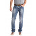 Blue jeans with a washed look, made of 100% cotton, has a flat front with two insert pockets, two patch pockets on the back with embroidered detailing, comfortable waistband with belt loops, brand patch on the waistband at the back, and a button and zipper closure