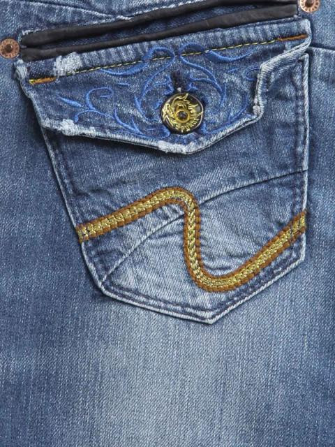 Blue washed jeans, has a low waist, torn look on the waistband and on the pockets, button and zipped closure, belt loops around the waistband, brand patch at the back on the waistband, two insert pockets with a branded patch pocket inside the right insert pocket in front and two welt button flap pockets at the back with zari work on the pockets