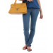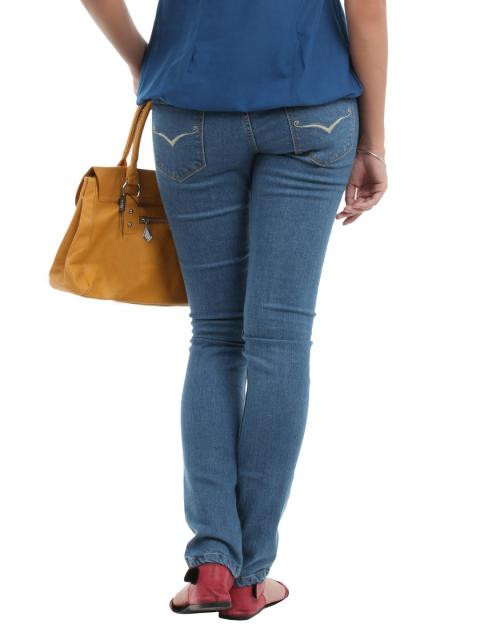 Blue medium-wash low-rise 5-pocket jeans, clean look with no fade, has a zip fly and button closure, a waistband with belt loops