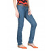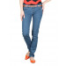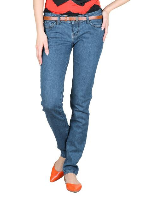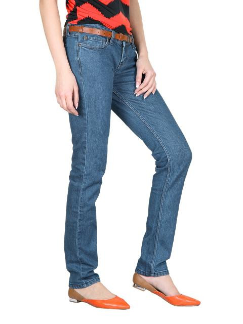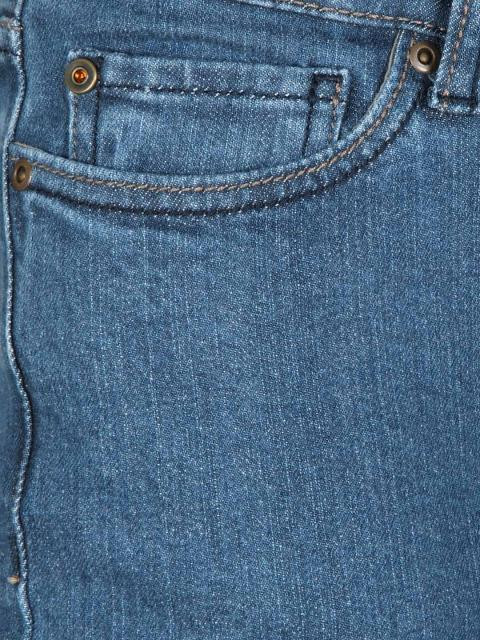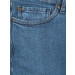 Blue 5 pocket jeans, lightly washed with whiskers at front, button and zip closure, waistband with belt loops
