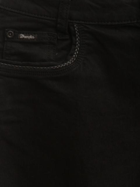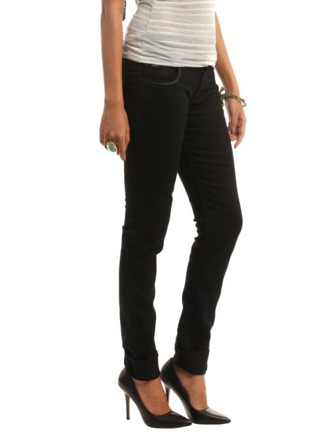 Black jeans, has a button and zipper closure at the front, two insert pockets at the sides and two patch pockets at the back