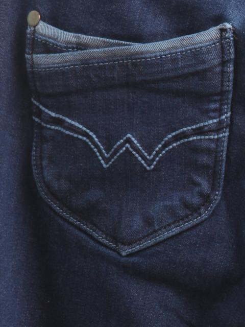 Blue jeans, has a button and zipper closure at the front, two insert pockets at the sides, a triangular patch pocket inside the right insert pocket and two patch pockets at the back