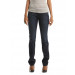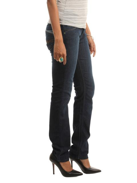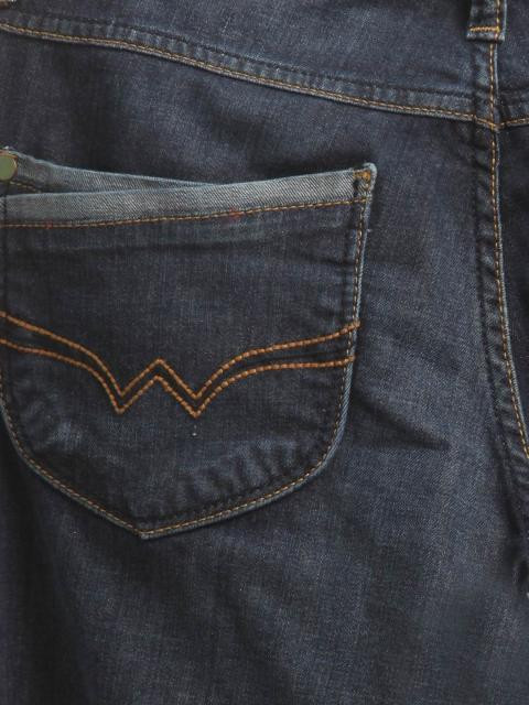 Navy blue jeans with insert pockets on the front, a patch pocket on the right side pocket, two patch pockets on the back and a comfortable waistband with button and zipper closure on the front