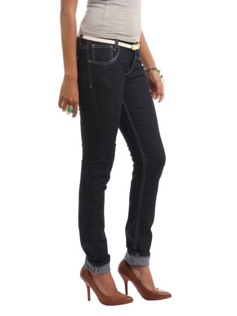 Navy blue jeans with insert pockets on the front, a patch pocket on the right side pocket, two patch pockets on the back and a comfortable waistband with button and zipper closure on the front