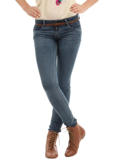 Blue jeggings with two scoop pockets in the front, elasticated waistband for a snug Fit with loops for belt, zippered fly with buttoned closure, two patch pockets at the back with branding at the right pocket and at the waistband at the back