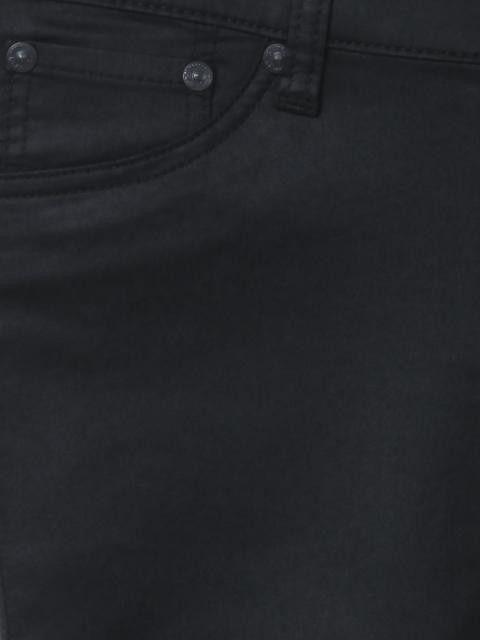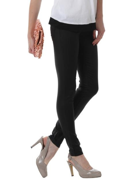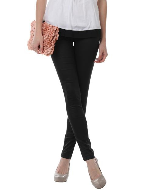 Black jeggings, has loops at the waist band, a buttoned waist and a zipper fly, two front pockets (has a smaller pocket at the right pocket) and two patch pockets at the back