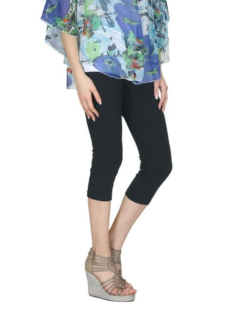 Black three quarter length leggings, has a broad comfortable elasticated waistband