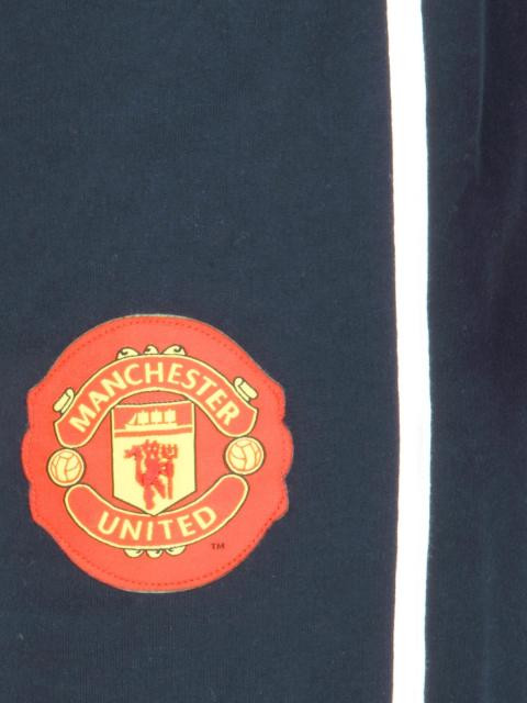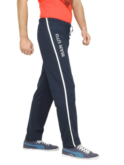Navy Official Merchandise manchester united trackpants made of 65% cotton and 35% polyester, has elasticated waistband with drawcord tie at front, single white stripe on each outer leg seam, no pockets, brand badge appliquéd on left thigh and Man Utd text printed on right thigh