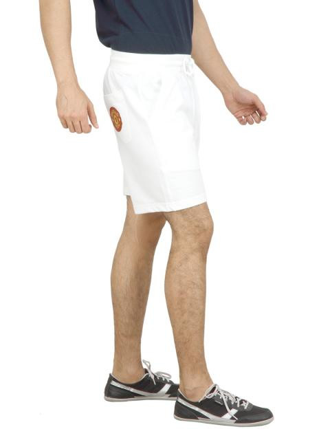 White official Merchandise manchester united jersey shorts made of 65% cotton and 35% polyester has elasticated waistband with drawcord tie at inner front, two side seam pockets, brand badge print on left thigh and a patch pocket on the left hip pocket with appliquéd branding