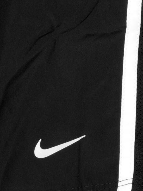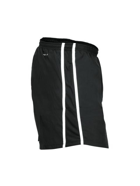 Black shorts made of 100% polyester with the lining made of 100% recycled polyester, is engineered with Dri-Fit technology, has an elasticated waist with drawcords, white stripe detailing along the length and nike swoosh printed on the left leg