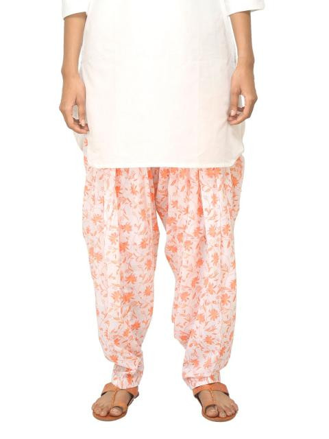 Orange printed cotton patiala pants, with a drawstring at the waist, pleating on the thigh and a tapered leg