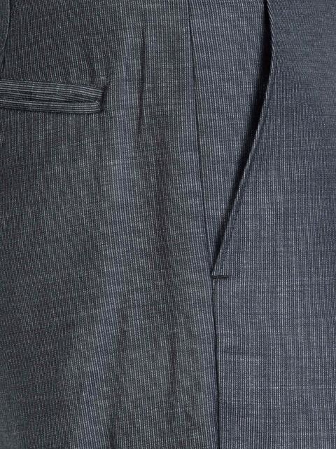 Grey striped trouser has flat front, pockets on the sides, two pockets at the back with button closures, looped waist, and a zipper and button closure on the front