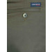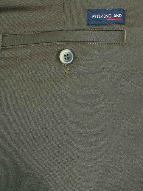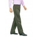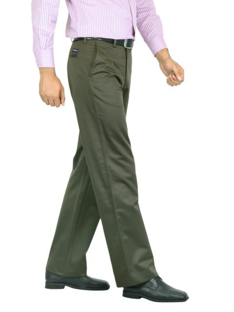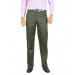 Olive green trouser made of a cotton blend fabric, has a flat front, pockets on the sides, two pockets at the back with button closures, looped waist, and a zipper and button closure on the front