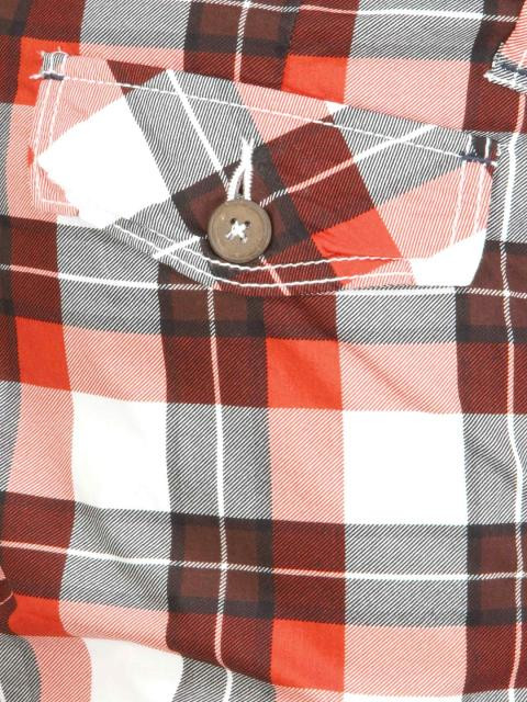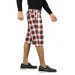 Red and grey check cargo shorts made of 100% cotton, has a flat front with insert pockets on the sides, patch pockets on the back with concealed button flaps and a comfortable waistband with belt loops and buttoned closure on the front