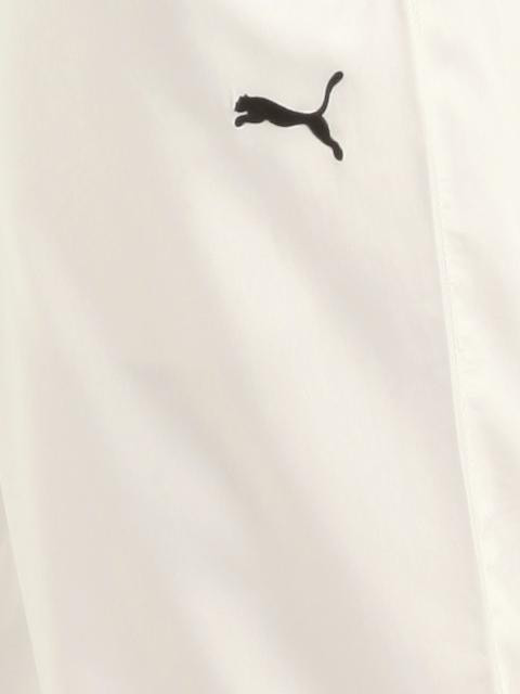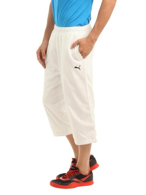 White three quarter track pants with an elasticated waistband and drawstring on the inside, two insert pockets on the sides, brand tab appliqued on the right pocket, embroidered logo on the left leg, drawstring at hem