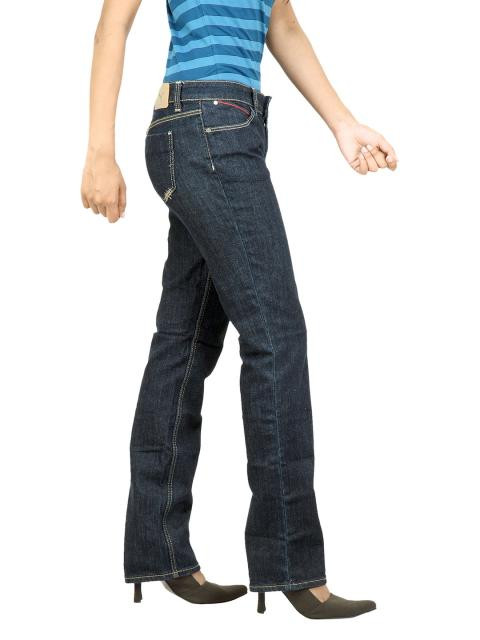 Blue denim trousers made of a blended fabric, has two side pockets with a patch pocket above the right one that has red stitch detailing, two large back pockets with stitch detailing, comfortable waist with loops and brand patch, and has a zippered and buttoned closureFitLoose fit; Regular riseFit