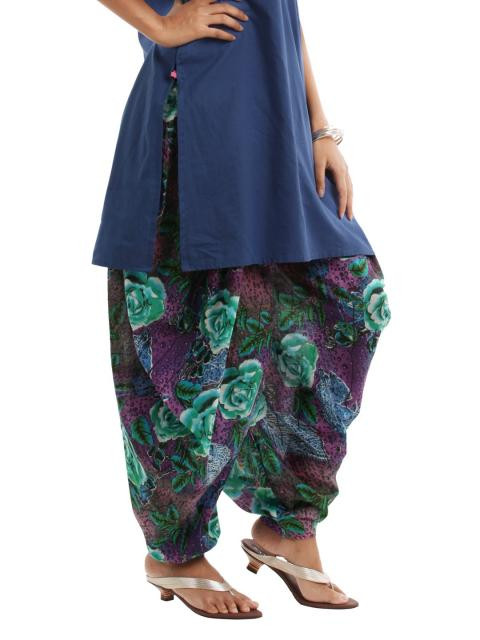 Printed blue harem pants with tones of red and green, has a slim waist band elasticated at the sides, tightly stitched pleats at the front and back that flare out below the hip region, the pants flare at the seat region up to the knee and taper from the knee to the hems onward