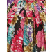 Printed blue harem pants with tones of red and green, has a slim waist band elasticated at the sides, tightly stitched pleats at the front and back that flare out below the hip region, the pants flare at the seat region up to the knee and taper from the knee to the hems onward