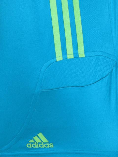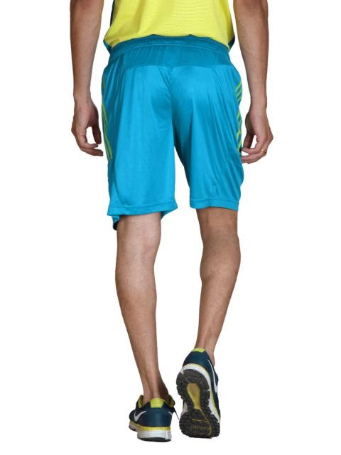 Blue shorts with a broad elasticated waistband with an internal drawstring for a snug Fit and comfort, fluorescent green tri-stripe detail on the sides for style, brand logo at the bottom on the left