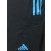 Black football shorts made of 100% polyster, adidas's signature three stripes along the sides in blue, mesh panels on the sides and back, comfortable elastic waist band with inner drawstring, and brand name and logo printed on the left leg