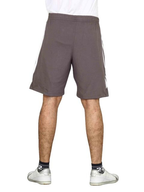 Iron coloured shorts made of CVC material, welt pockets, drawcord elastic waist, embroidered logo on the left and adidas Essentials 3-Stripes along the length of the legs