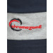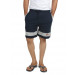 Navy blue soccer shorts, welt pockets at side, elasticated waist with drawstrings, grey panelling with embroidered branding near hem