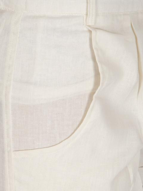 White hot pants with a button and zipper closure on front, belt loops, pockets on the sides and welt pockets at the back