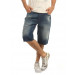 Blue washed denim shorts, has a button and zipper fly at the front, two front pockets and two at the back and has distress detail on the front