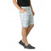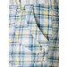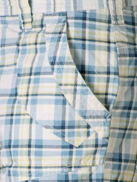 Blue check shorts with a looped waist with a button and zipper closures, two side pockets, and two buttoned flap pockets on the thighs and two back pockets with buttoned flaps