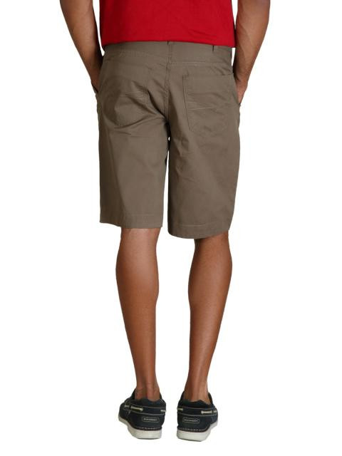 Brown coloured shorts, has a waistband with a button and zip closure, two insert pockets on the sides and two patch pockets at the back with embroidered detailing
