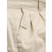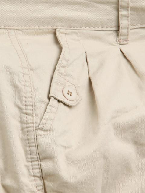 Beige shorts with two curved pockets in the front with strap and button detail for style, waistband with loops for belt, zippered fly with buttoned closure, inverted box pleats from the waistband, upturned hem with gathers above it, two double welted pockets at the back