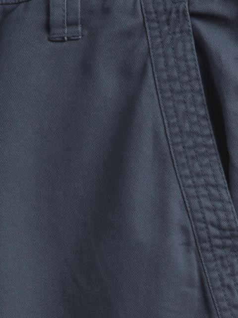 Dark blue coloured shorts, has a belt loops around the waist, buttoned closure at the waist with a buttoned fly, two insert pockets in front and two welt pockets at the back