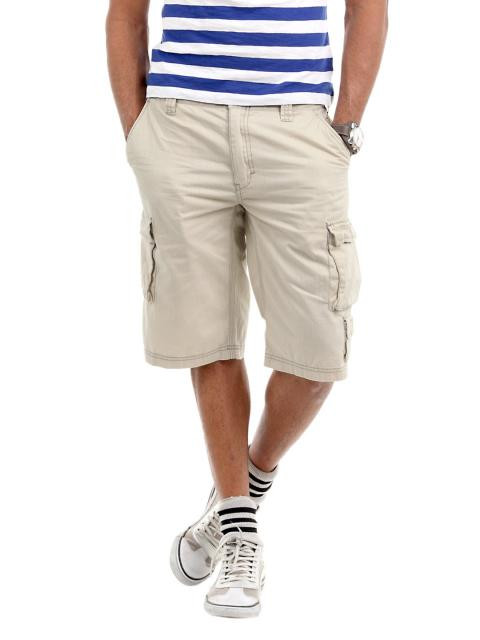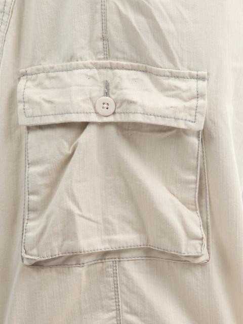 Cream shorts, weave design, two slant pockets front, two bellow pockets with buttoned flaps at the side, one additional bellow pocket with buttoned flap at the side on the left near the hem, patch pockets at the back, waistband with loops, zippered fly with button, top stitch detail in grey, drawstring on waist on the inside