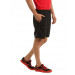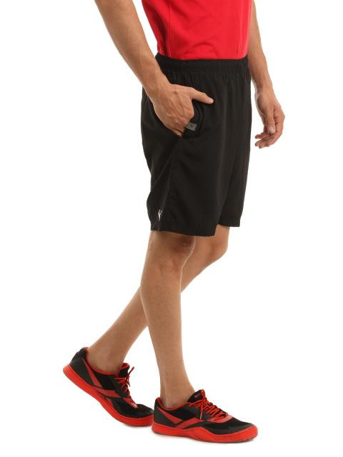 Black shorts with a mesh like inner, an elasticated waistband and drawstrings on the inside, side pockets, brand tab appliqued below the right pocket and printed branding on the left thigh