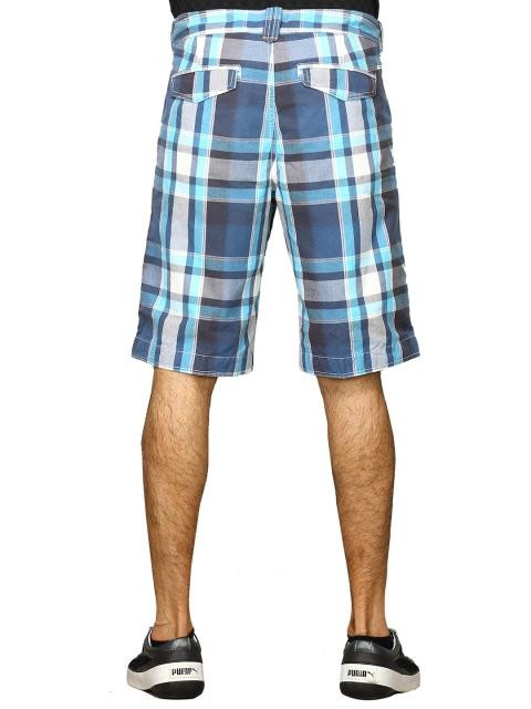 Blue and white checked shorts, made of 100% cotton, drawstrings on the inside with zipper fly, pockets on the sides with two pockets on the hips