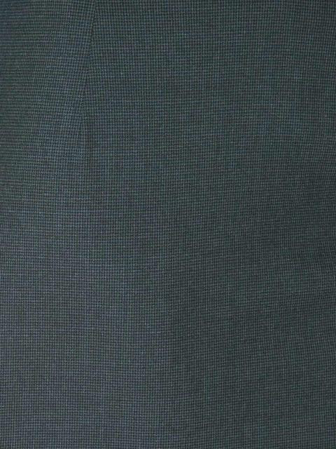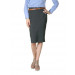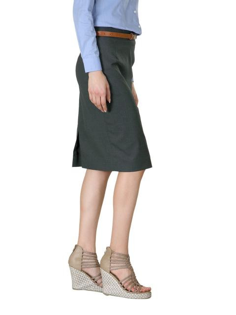 A charcoal grey formal skirt with self patterned checks, has a narrow waistband, two buttoned flaps at the back of the waistband, a concealed zipper at the back and a slit from the hemline in the centre back