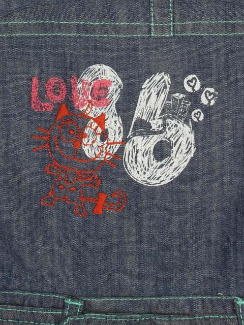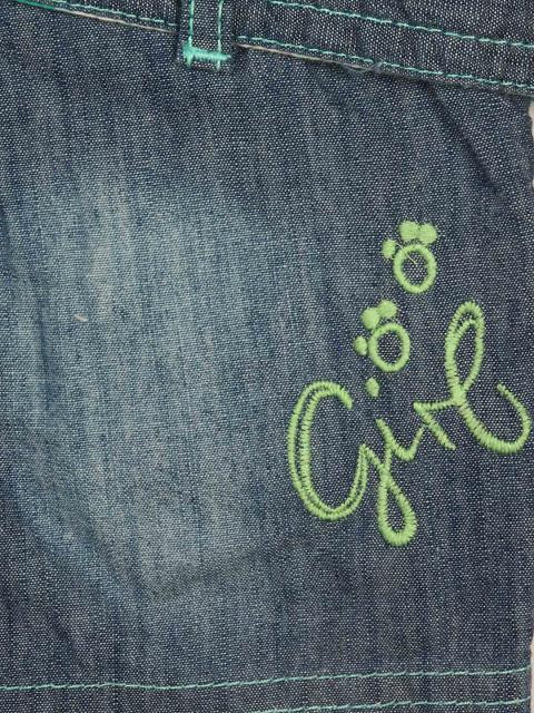 Light blue dungarees made of 100% thin cotton denim, with aqua green stitch detailing, aqua green polka dotted fabric backing on the straps, belted waist with button closures, two insert pockets on the front, one patch pocket on the back and has an embroidery/graphic embellishment on the front